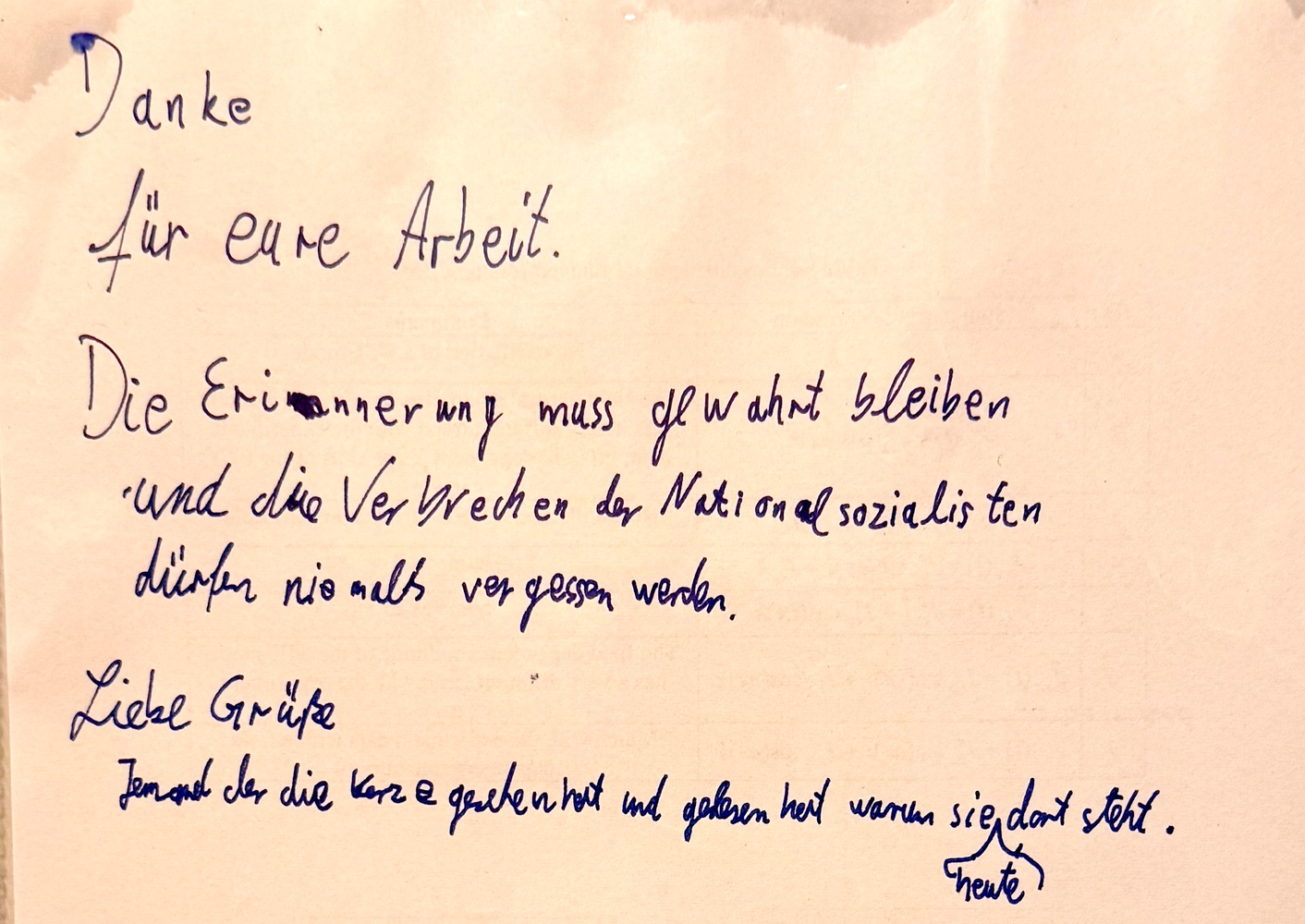 Wir bedanken uns herzlich bei der unbekannten Person, die uns am internationalen Gedenktag für die Opfer des Nationalsozialismus (27. Januar 2026) einen anonymen Brief mit wertschätzenden Worten neben der Gedenkkerze in der Julianenstraße hinterlassen hat. Vielen Dank auch für die danebenliegenden Süßigkeiten.